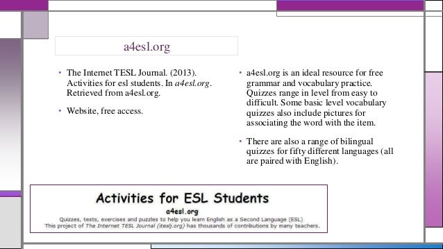 Select one of the five categories below to expand the list of ESL Teaching Resources Lesson Activities 75 Resources Lesson activities include games, puzzles,